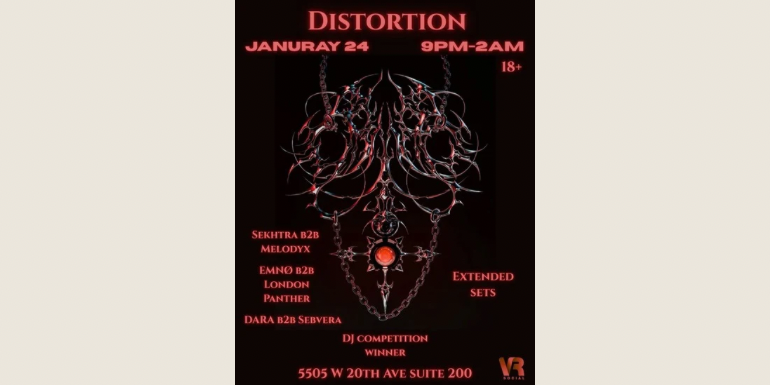 Distortion at VR Social Saturday, January 24, 2026 9 p.m. to 2 a.m. 18+ Bring your friends for a night of drinks, dances, and extended DJ sets. + Add to Google Calendar + iCal / Outlook export 00 days 00 hours 00 minutes 00 seconds Date Saturday - Sunday, January 24 - 25, 2026 Time 9:00 pm - 2:00 am Location VR Social BLDG01 #200 Share this event
