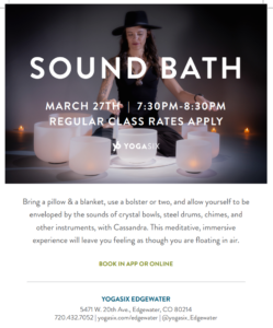 Bring a pillow & a blanket, use a bolster or two, and allow yourself to be enveloped by the sounds of crystal bowls, steel drums, chimes, and other instruments. This meditative, immersive experience will leave you feeling as though you are floating in air.
