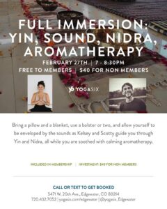 Experience deep rest in this 90 minutes of Yin, Sound, Nidra, and Aromatherapy with Kelsey & Scotty! Option to bring extra pillows & blankets.