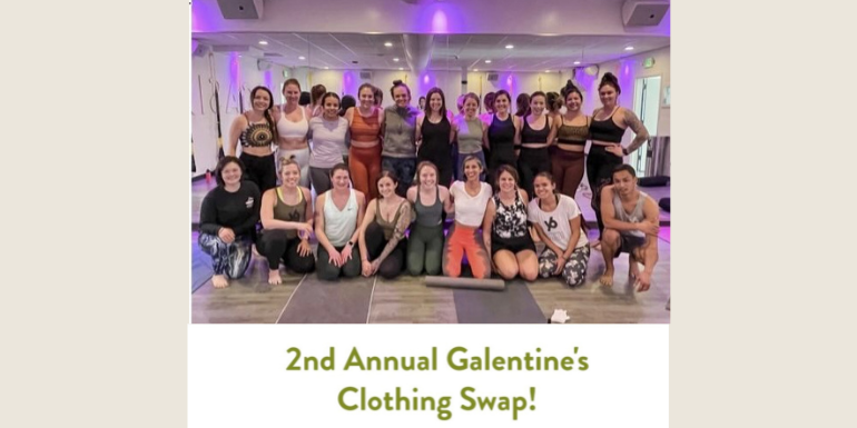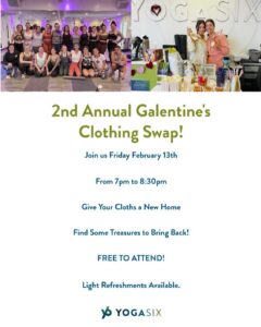 Celebrate Galentine’s at YogaSix with their annual clothing swap! Stop by anytime now through February 13 to drop off your gently used clothes, then return on Friday, February 13 to score some fun new finds.