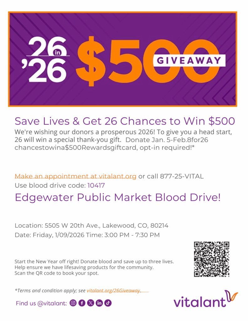 The Vitalant bloodmobile will be on site at Edgewater Public Market on Friday, January 9, from 3 p.m. to 7:30 p.m. Blood donations are vital; we hope that many of you who are able to will donate blood that day!